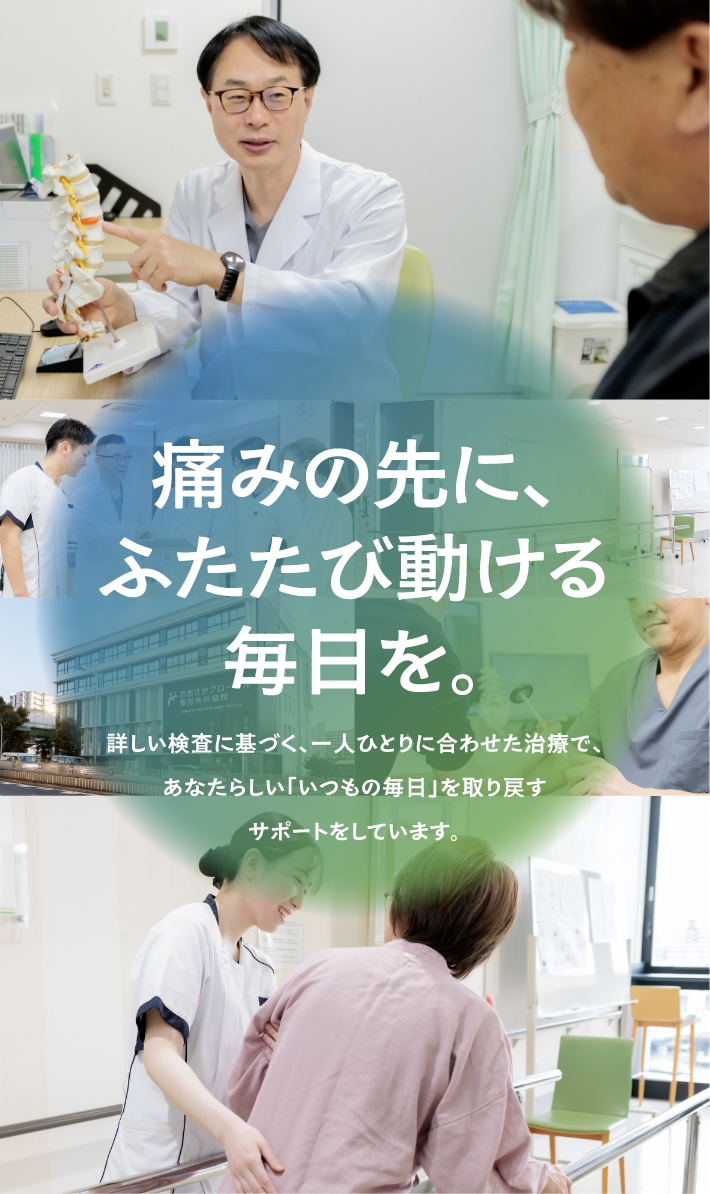 当院は、腰痛や膝痛、肩の痛みを専門医が最適な治療で早期回復をサポート。低侵襲手術やリハビリを活用し、脊椎外科、関節外科、手外科で高い実績を誇ります。大阪に住む皆様に信頼される医療を提供しています。