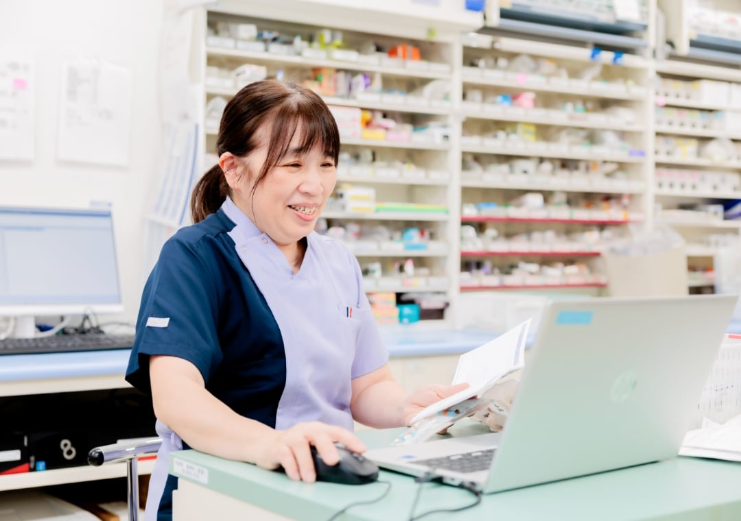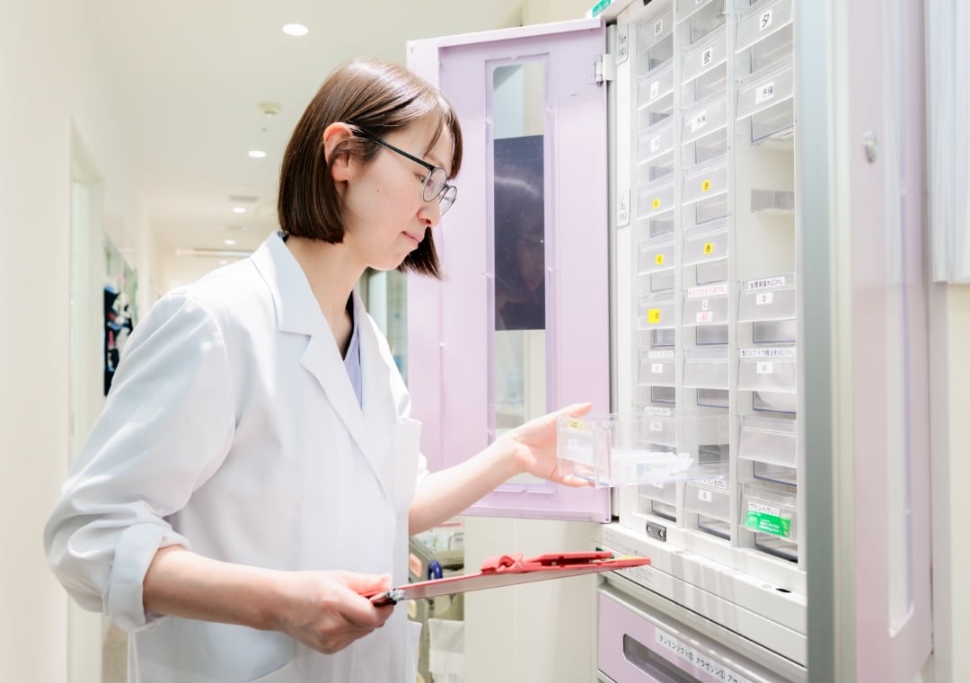 入退院サポートセンターのスタッフと協働して、手術などで入院される予定の患者さんを対象に、普段使用されているお薬の情報の確認をしています。