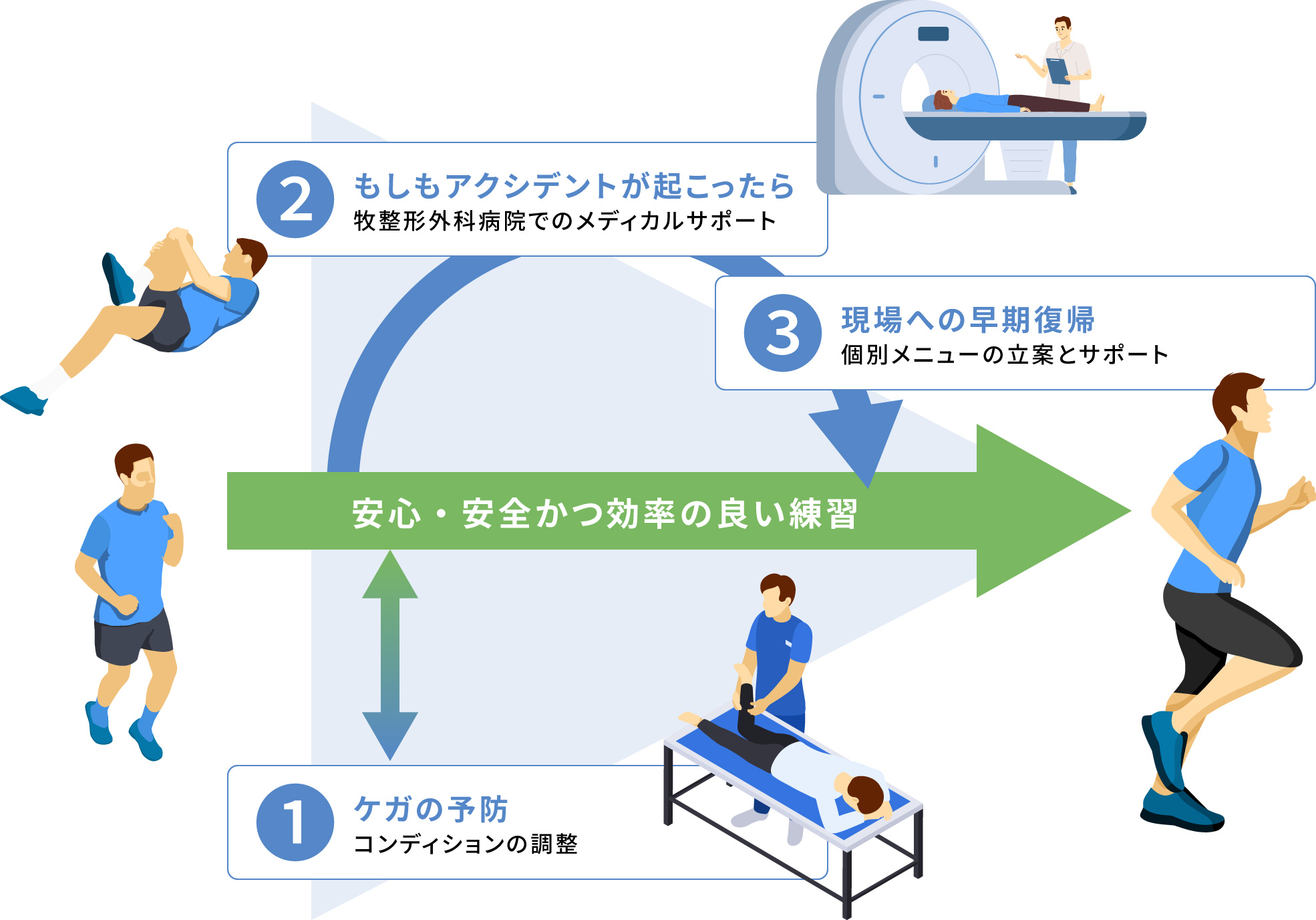 やむを得ず練習を中断し、治療に専念するケースもあるかもしれません。その際はできる事、控えていく事を明確にし、最短での復帰を全力でサポートします。